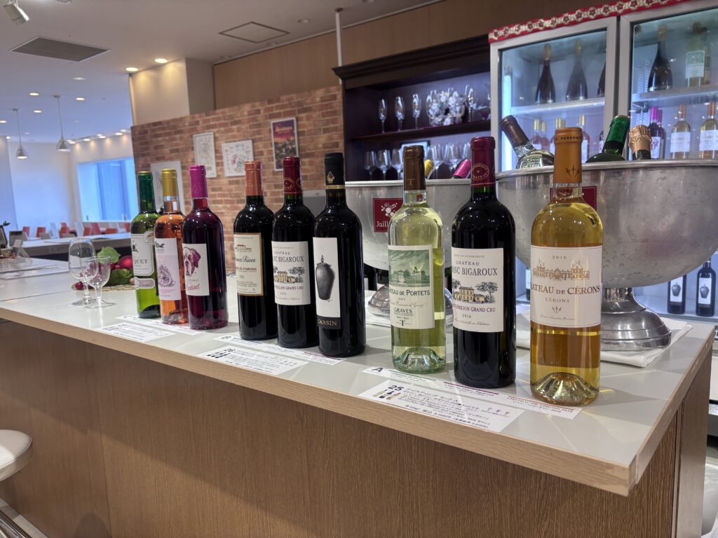 - 10種類のボルドーワインをグラスでお飲みいただけます(80ml〜60ml)。会場内飲食スペースのほか、店内バーカウンターもあります。